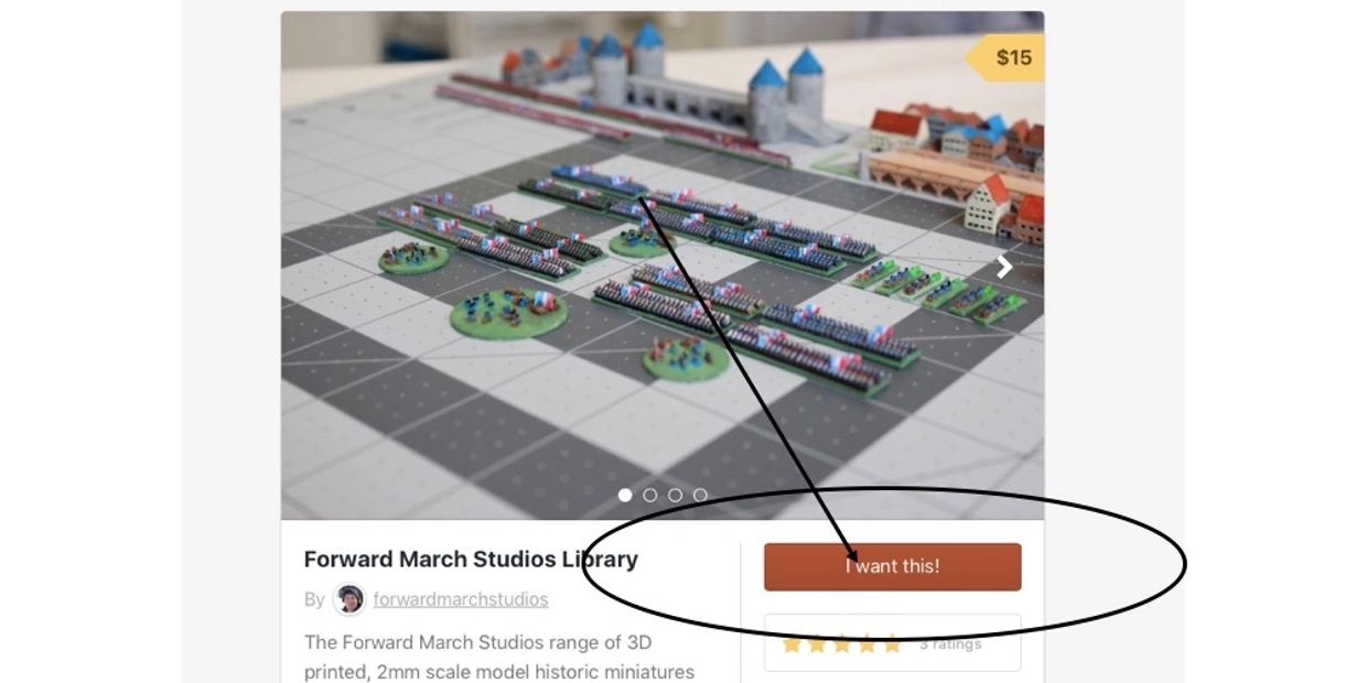Click the button on the homepage that says "BUY FORWARD MARCH MINIATURES." This will take you to the Gumroads website that is used as a point-of-sale and where the files will be stored after you purchase them.