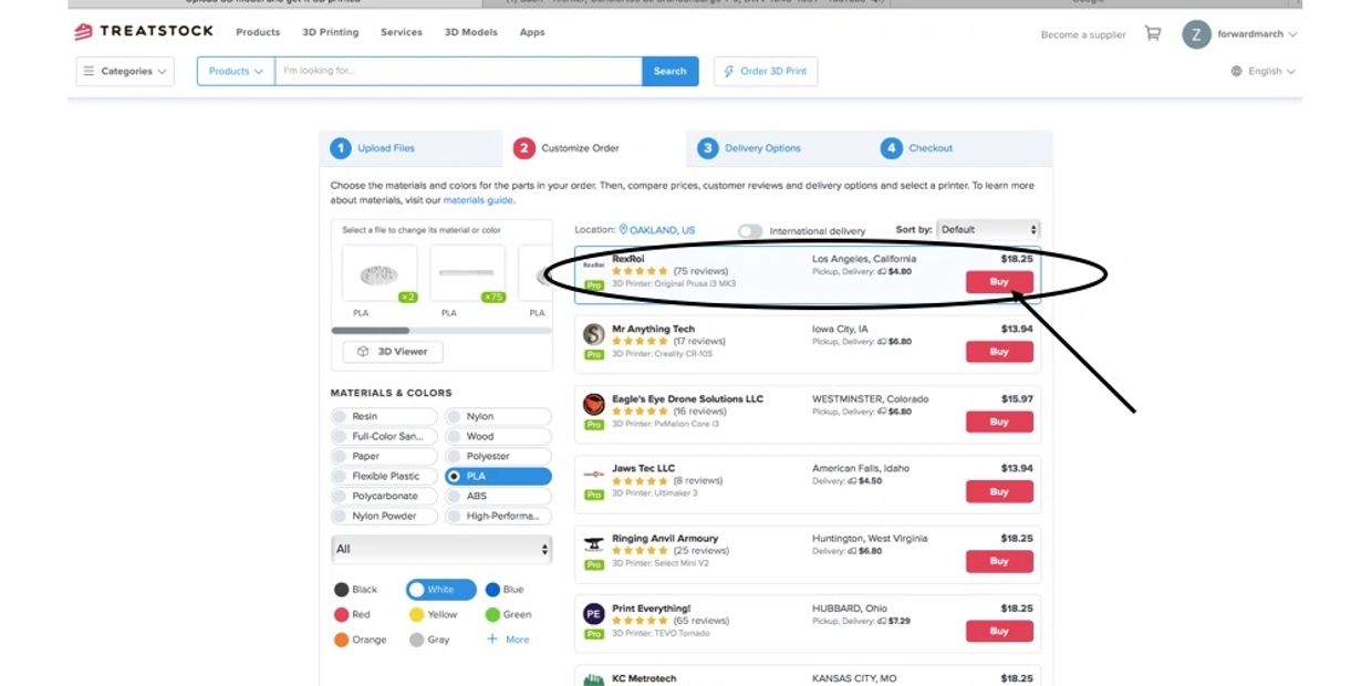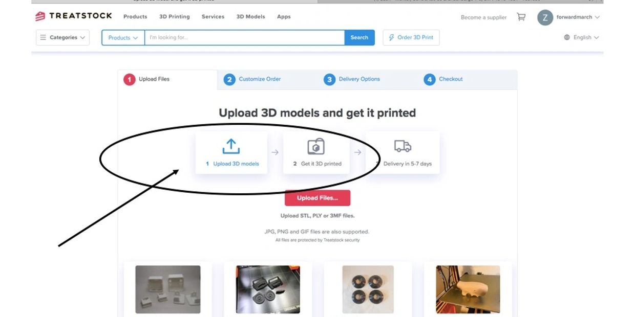 The first step to turning your Forward March Studios files into physical copies is to go to the website of your 3D printer service. As described above, we are using www.treatstock.com .
